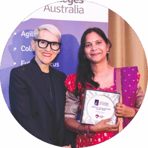 Helene Culleton was awarded Trainer of the Year – Highly Commended at the 2024 Community College Australia (CCA) event. Helen is passionate about helping individuals find their passion and reach their full potential. In addition to an extensive teaching career, Helene’s background includes fine arts, executive leadership and management, and working with disadvantaged youth. She is a passionate educator who joined Atwea College in 2022 and delivered courses ranging from short skill sets to full qualifications in the BSB and FSK Training packages.